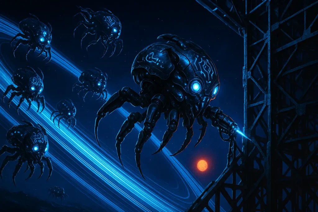 En las lunas Anemoi de Aeolia, un enjambre «saltalunas» de nanitas carnosas reptó entre cráteres. El documental lo trata como manual en vivo. Autorreparación. Autorreplicación. Autodirección. Las puntuaciones de riesgo parpadean en pantalla y luego se desvanecen bajo el silencio.