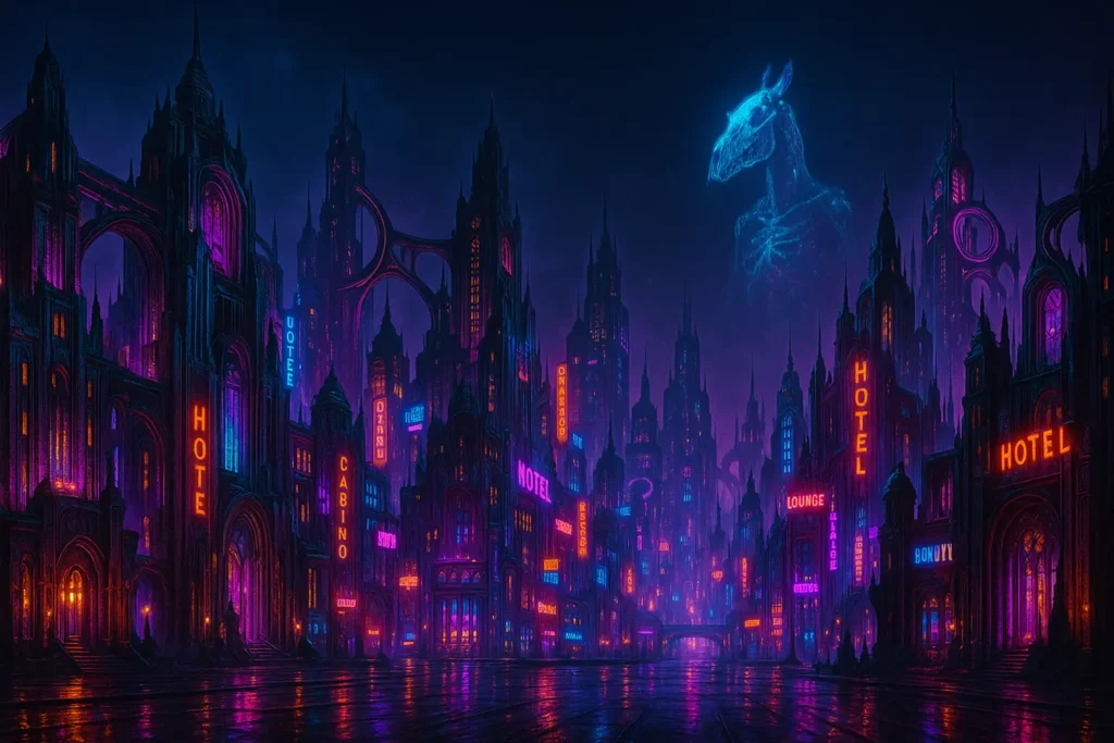 Metrópolis luminosa construida sobre sombras. Las fachadas resplandecientes de San Orfeo ocultan un comercio brutal e institucionalizado (Crédito: Kenomitian).