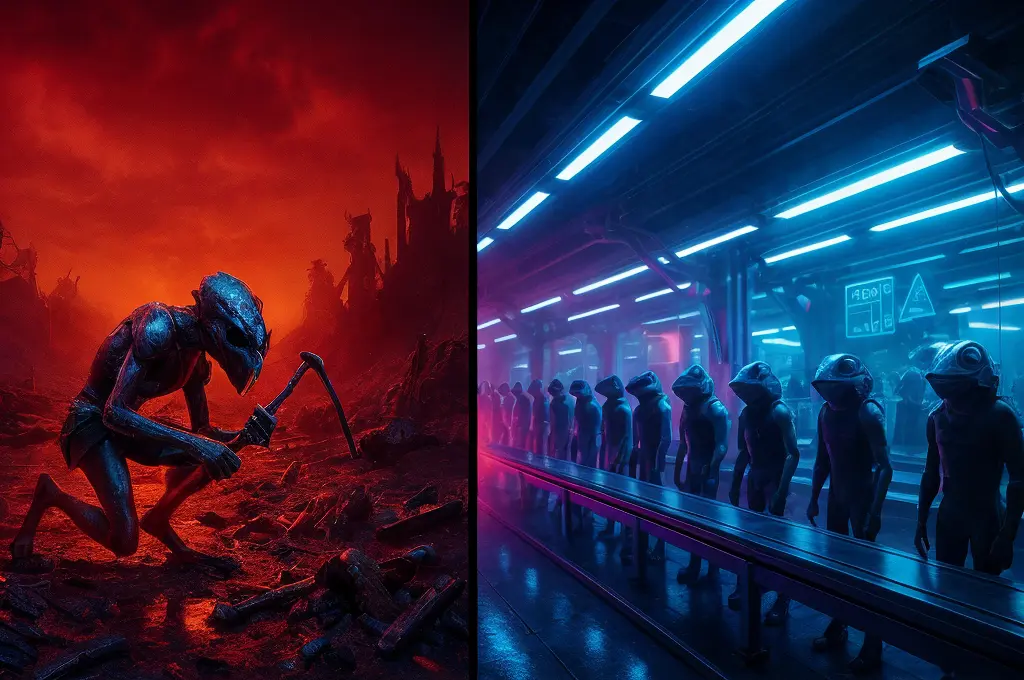 Del trabajo desesperado a la desesperación industrializada: el comercio de materiales sobrenaturales se ha convertido en una cadena de montaje del sufrimiento (Crédito: Kenomitian).
