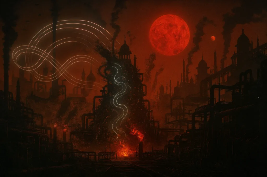 Una amenaza antigua y hasta ahora inactiva ha irrumpido de pronto en el mundo. El suceso ha abierto una profunda brecha entre la respuesta del Sacerdocio Dharmista —con autoridad espiritual y cívica— y la de Pantagruel Inc., volcada ante todo en su rendimiento económico. La ciudadanía queda atrapada entre el deber sagrado de proteger el alma y el mandato corporativo de seguir trabajando.