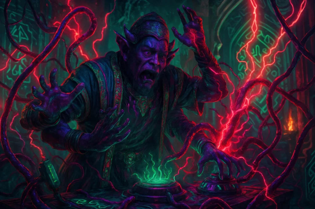 La presencia del Nigoda ha perturbado el propio entramado de la red energética mística de Kenoma. Rituales mágicos fallan y producen resultados impredecibles mientras las corrientes de Orgón quedan paralizadas por la entidad ultramundana (Crédito: Kenomitian).