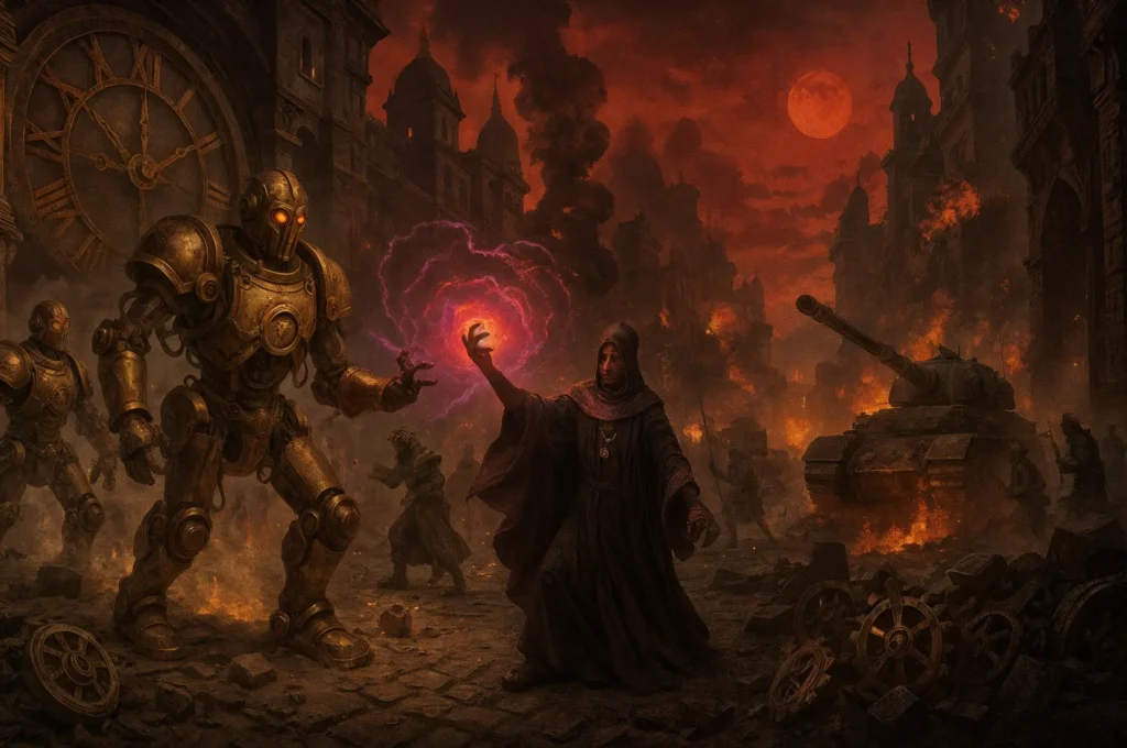 Hechicero de la Critarquía Kyriana, devoto practicante de la sabiduría hasturiana, emplea su magia ordenada para hacer frente a un devastador carro de combate dieselpunk del Califato Uróboros, símbolo del abismo ideológico en el corazón del conflicto (Crédito: Kenomitian).