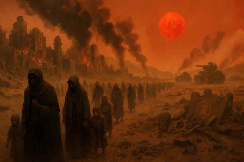Refugiados huyen del brutal conflicto; su travesía está marcada por la sistemática limpieza étnica y el desplazamiento forzoso de poblaciones perpetrados por el Califato Uróboros, que deja tras de sí una estela de destrucción (Crédito: Kenomitian).