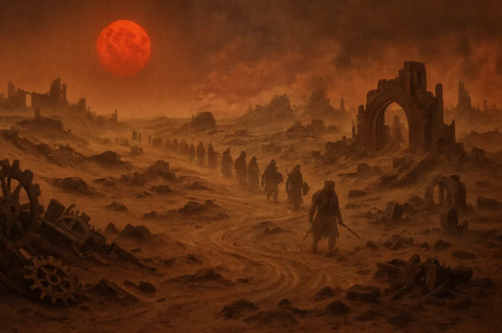 Un grupo de eruditos y místicos, encabezados por la renombrada arcanista Herut Shafir, huye a través de un paisaje yermo y arrasado por la guerra, llevando consigo lo que queda del saber arcano kyriano (Crédito: Kenomitian).