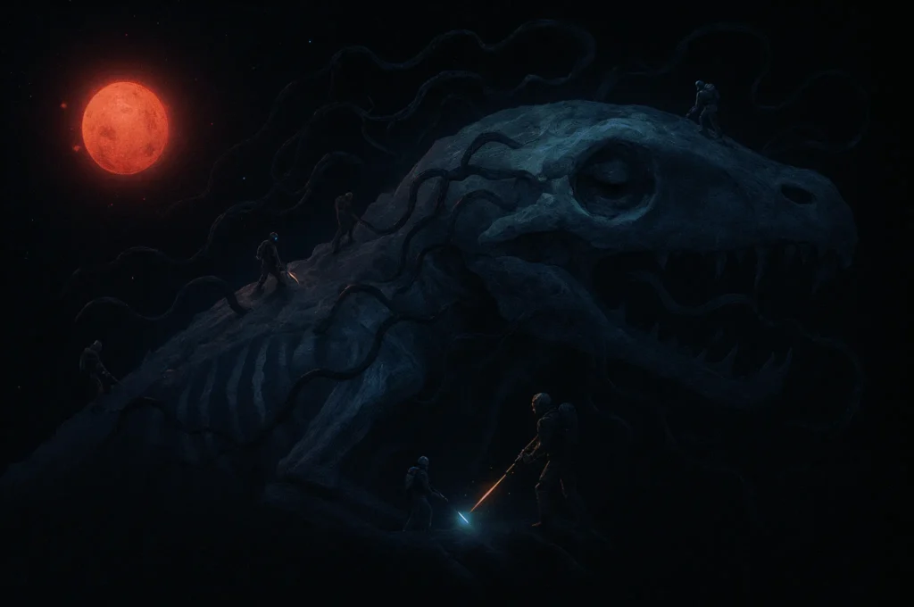 Los cadáveres de la creación, los Ylidheem, son despojados de hierro meteórico y “rocas lunares”, planteando preguntas sobre el mismísimo tejido del cosmos (Crédito: Kenomitian).