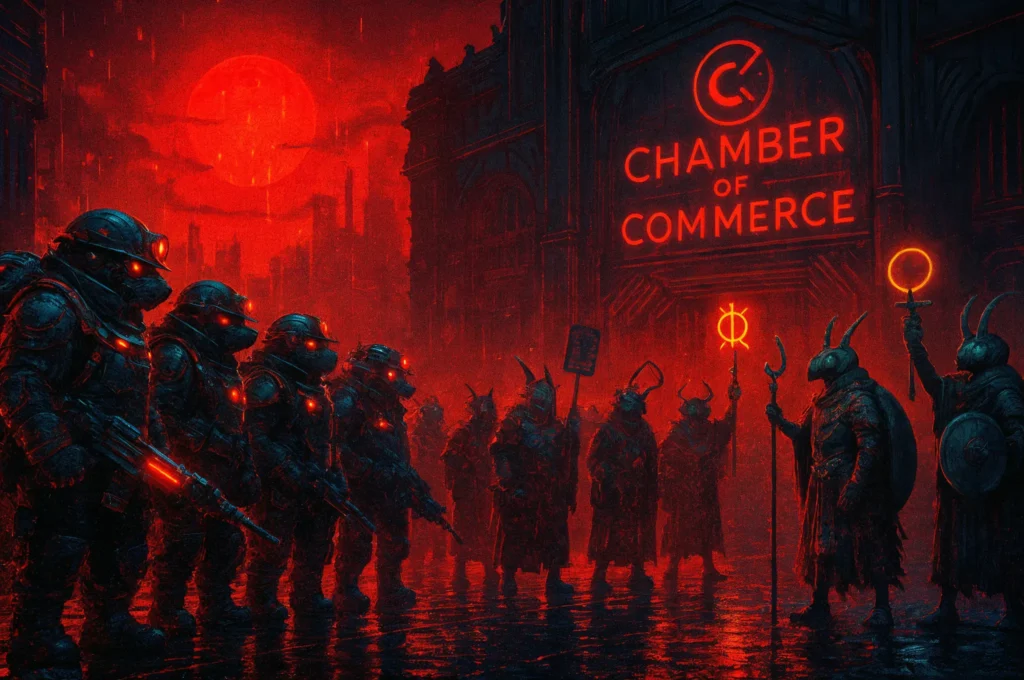 Estallan choques en Saklas mientras los gremios mineros y los animistas protestan ante el Salón de Intercambio Atlante, donde se comercia con metales demoníacos (Crédito: Kenomitian).