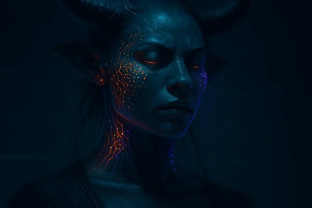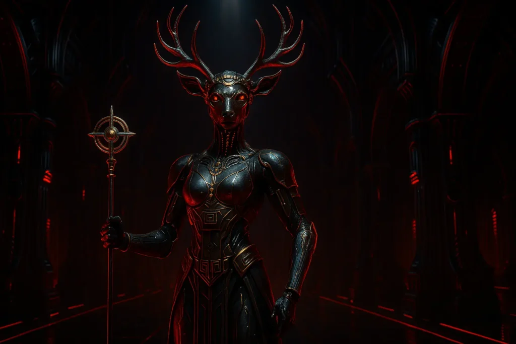 Lo que unifica todas estas modificaciones es la convicción termagantina de que ciencia y hechicería son sustancias continuas. Los laboratorios hacen de templos; los cirujanos, de sacerdotes-técnicos. Las creaciones de los tecnomantes del Estado se llaman biocircuitería: lógica viva que canaliza corriente e incantación. Esta síntesis culmina en la Red Noosférica, una conciencia distribuida que enlaza a las funcionarias modificadas a través de sus tocados. La información fluye telepáticamente entre ministerios, cifrada por cantos rituales. Las decisiones se toman de forma colectiva, instantánea y sin debate: un coro tecnocrático guiado por la señal divina.
