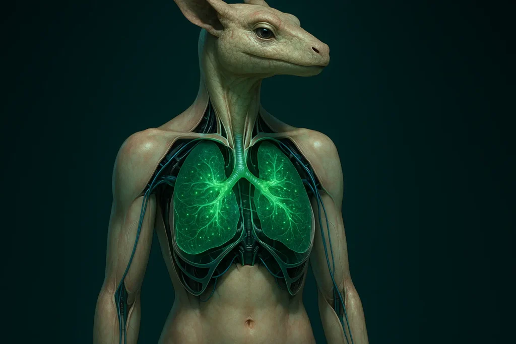 Conjunto de Simbiontes Optimizado por Yig: pulmones re-ingenierizados albergan vida simbiótica, reponiendo la vitalidad de las funcionarias durante largas jornadas burocráticas (Crédito: Kenomitian).