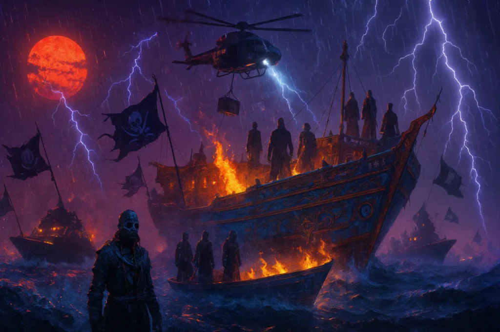 Los supervivientes describen flotillas piratas que se autodenominan Cohortes Asanbosam y blandan los dones de la progenie de Shâchath. Zarpan de buques nodriza en esquifes veloces, apresan a las tripulaciones y exigen rescates con entregas de efectivo por helicóptero. Los cascos que no acatan son incendiados durante «adjudicaciones rituales», dicen testigos. Las acusaciones apuntan a un patronazgo Diabólico superpuesto: la Mastema de Belcebú, los Shedim de Belial y los Shārāp Me’ōpêp de Moloch.
