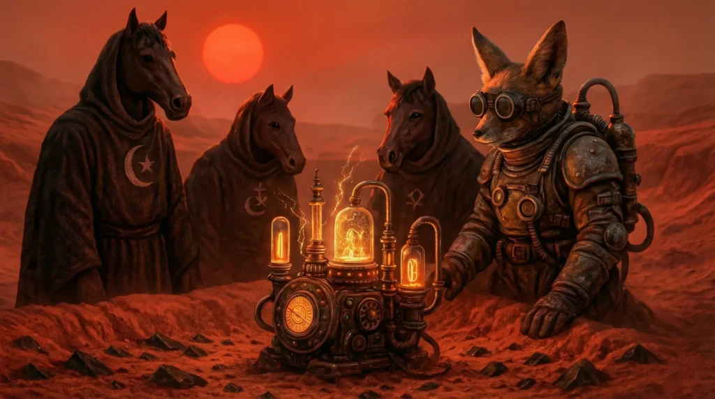 Un convoy de vehículos diéselpunk cruzó bajo el cielo carmesí de Yaldabaoth en dirección a uno de los desiertos más implacables de Kenoma. Su objetivo era una leyenda persistente: Zauz, la Ciudad de Obsidiana. La expedición fue autorizada por el Califato Uróboros y escoltada por policía militar encargada de hacer cumplir la ley arcana. La misión tiene un peso que va más allá de lo académico. Zauz, si se verifica su existencia, anclaría la historia kenomita a un periodo de vertiginoso ascenso que terminó en catástrofe. El final de la Era Pneumática —el Angelismo de Cthugha, Dios del Gobierno— marca un punto de inflexión en la escatología del Califato. Cualquier vestigio de esa era eleva las apuestas doctrinales, científicas y políticas.