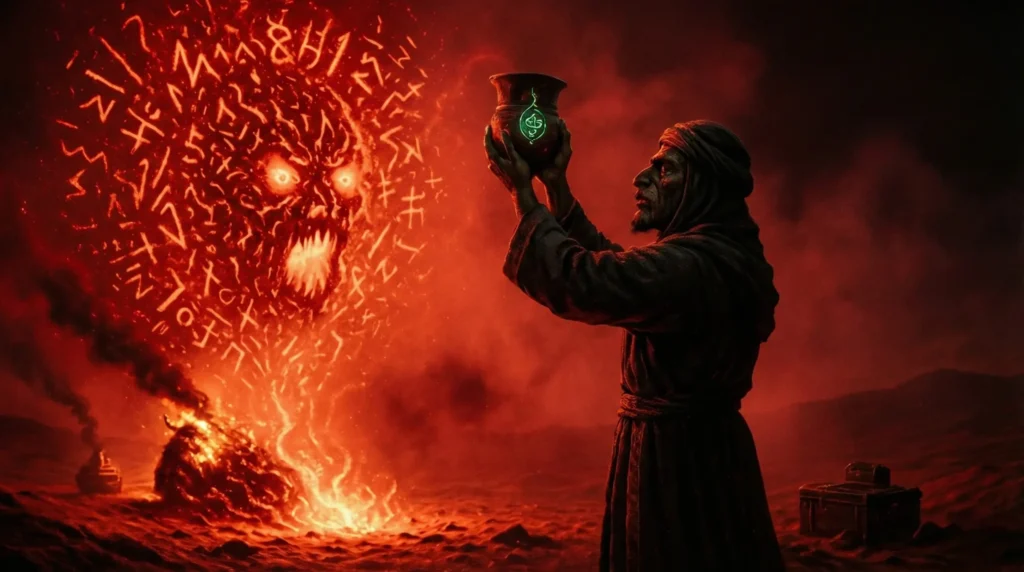 Al amanecer, la «auditoría de fantasmas» de la MAA arrojó una única anomalía de alta intensidad. El equipo la clasificó como un Tzalmavet —una entidad vinculada a la Senda de la Magia de un mago fallecido, que lanza hechizos de forma refleja cuando se producen perturbaciones—. La manifestación se presentó como una nube carmesí de números inestables y espinas de escritura que formaban y deshacían un rostro. Al-Ziyad intervino con licencia empleando un artefacto de Mendes: un recipiente negro mate grabado con el sigilo de Barqan y vinculado a la Nigromancia. «Se nos permitió un breve intercambio mediado», relató. «El contenido fue fragmentario y doloroso». La entidad denunció «el caos inherente a la existencia sapiente» y mostró una llanura golpeada por tres soles donde cada grano «era una gota congelada de sangre Arcóntica».
