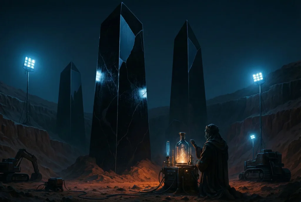 Hacia el mediodía, el equipo comenzó a abrir zanjas someras en los puntos señalados. A diez metros de profundidad, las hojas dieron contra piedra. Los trabajadores dejaron al descubierto un plano de obsidiana impecable, veteado de inclusiones que devoraban la luz. Luego apareció un borde, luego un ángulo demasiado perfecto para ser geológico. «No eran columnas», explicó Al-Ziyad. «Eran obeliscos. Muchos». El estilo es vertical y contenido. Varias superficies vibraban al contacto, cada una en una tonalidad distinta y doliente. Un topógrafo lo describió como «música atrapada en vidrio».