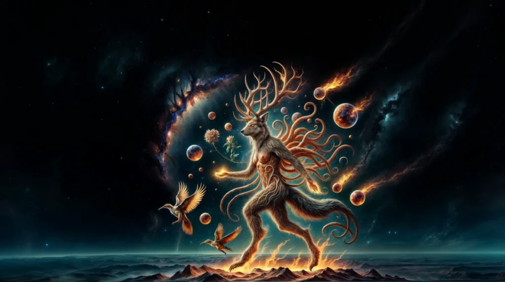 Abraxas (hermafrodita), venerado como El Ser y Gran Arquitecto, encarna el principio sustentador del cosmos. Mundanamente es todo; para el ojo oculto, un ultraorganismo andrógino engendrado en el éter, con cabeza de león de sable y tres ojos y diez mil alas de formas geométricas. Sus piernas, rematadas en tres tentáculos de pulpo de anillos azules, portan la Rueda de las Edades, un grial cristalino de magia y una carta astral; en las manos lleva el Augoeides (orbe hueco) y una rama de Etz Autozoon, rodeado por siete enjambres de ojos irisados. Objetivo pero curioso y afectuoso con su linaje, reina en la Ousía desde un trono de barbos dorados, llevado por un zorro de nueve colas sobre una medusa flotante, entre nieve, hojas de arce y trillones de colibríes.