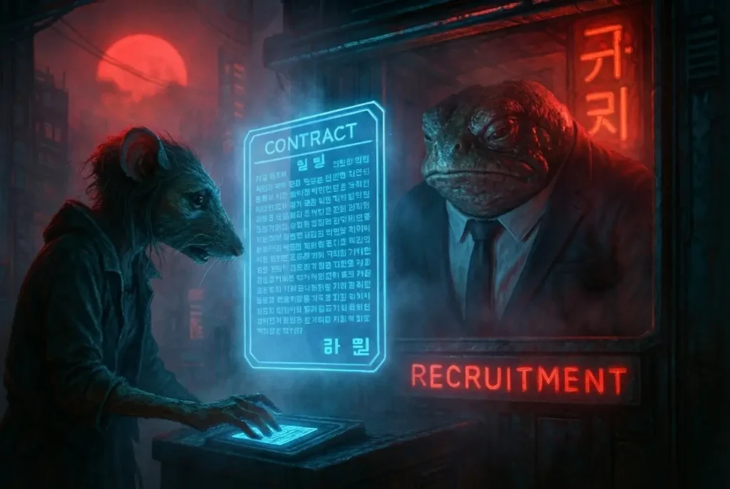 El mercado de la desesperación: firmar el contrato de «esclavitud voluntaria», la elección que cambia la vida entre el alivio de la deuda y la transferencia permanente de la personalidad (Crédito: Kenomitian).