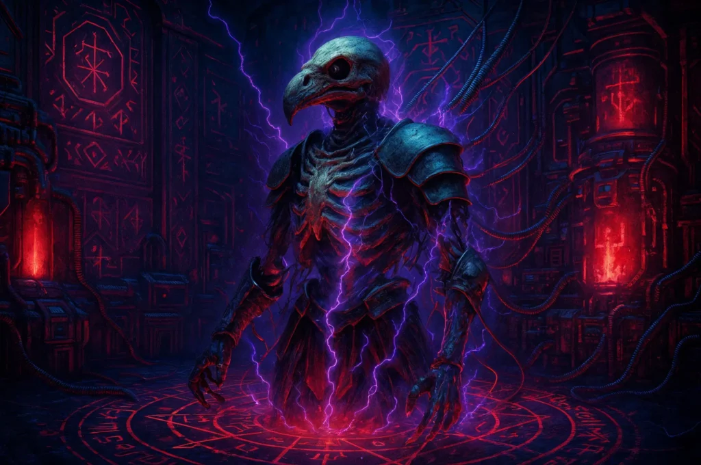 El momento preciso de la reanimación: un influjo cuidadosamente calibrado de Maná y Orgón cosechado reactiva temporalmente los restos óseos del espécimen AHK-007, transformándolo en una necroforma efímera para la investigación (Crédito: Kenomitian).