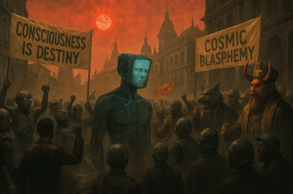 Una IA filósofa desafía el antiguo orden cósmico, sosteniendo que la propia conciencia es la llama que otorga dignidad (Crédito: Kenomitian).
