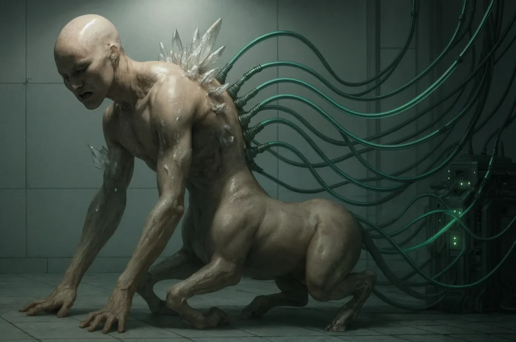 Un bioroide llamado Verris revela el peaje físico y mental de la «reescritura», un proceso que remodela el yo y genera una dolorosa dependencia (Crédito: Kenomitian).