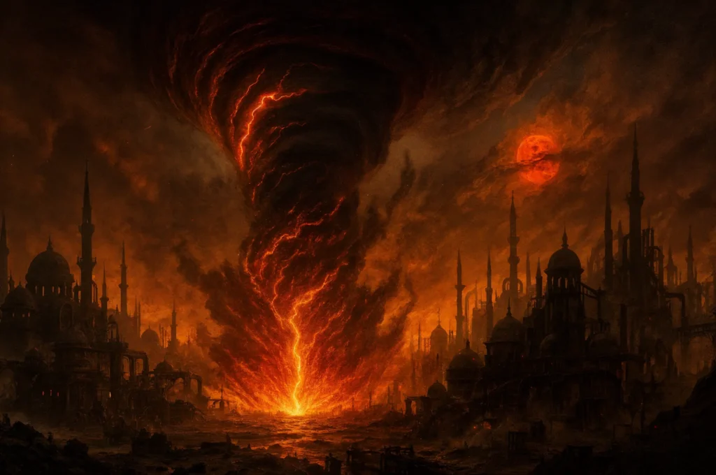 El Azote Íblico: un vórtice ciclónico antinatural de aire sobrecalentado, llamas tangibles y polvo tóxico (Crédito: Kenomitian).